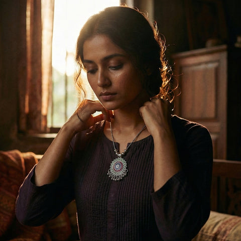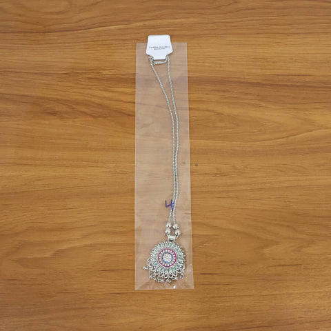 This beautifully crafted antique silver-tone oxidized pendant necklace showcases a detailed floral mandala design highlighted with vibrant enamel accents and intricate metalwork. The circular pendant is adorned with delicate hanging ghungroo-style beads that add movement and traditional charm. Paired with a sturdy beaded chain, this necklace blends classic ethnic aesthetics with a contemporary statement appeal. Ideal for enhancing traditional outfits and fusion wear, it brings an artistic and handcrafted touch to festive and cultural looks. A timeless imitation jewellery piece designed to elevate your ethnic jewellery collection.