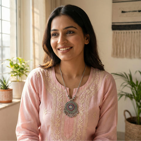 • Floral mandala-inspired oxidized pendant design